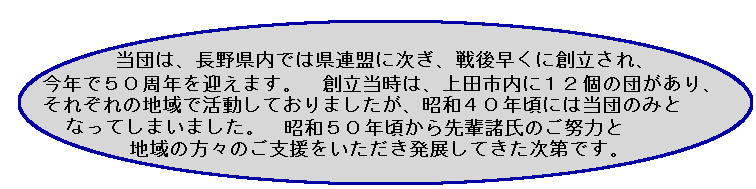 | 「創立50周年を迎えるにあたり、情報化時代の象徴でもある ホームページの開設を行い、できるだけ多くの方々に ボーイスカウト運動や当団の活動をご理解いただければ幸いです。 また、現在上田市内にある第5団、13団、14団の益々の発展と 3年後に完全実施される学校週5日制をふまえ、スカウト活動は 子供たちの幸福な成長に大きく貢献できることを自負してやみません。」 尚、上田第5団の歴史を述べるにあたり、上田のボーイスカウトの変遷 にもいささか触れたいと思います。 |